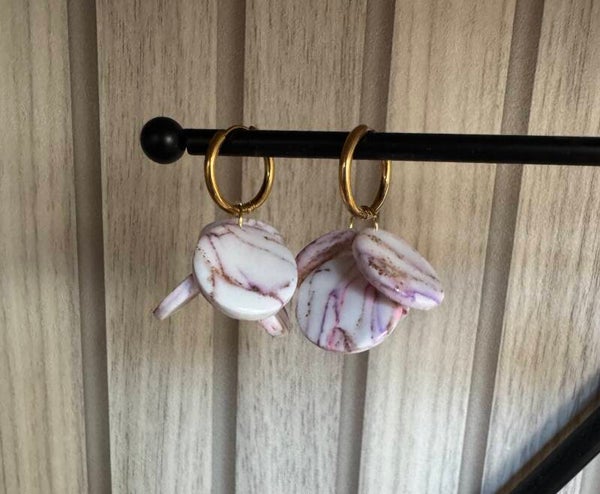 Boucles d'oreilles en pâtes polymère blanche rose et violette faite a la main.